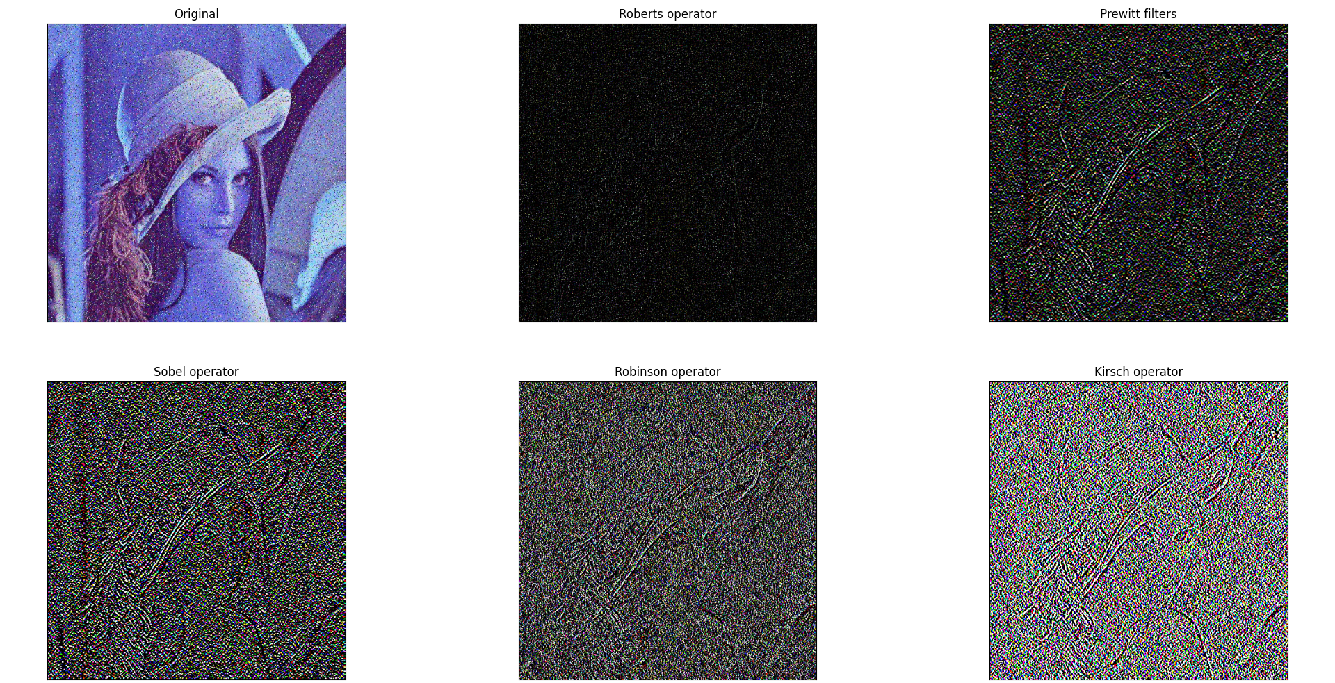 First apply Gaussian Smoothing mask to blur the lena_noise.jpg, followed by applying Robinson operator: Px first, then Py. Print the after processed image. (首先應用高斯平滑蒙版模糊lena_noise.jpg,然後應用羅賓遜運算符:首先是 Px,然後是 Py。列印處理后的圖像。)