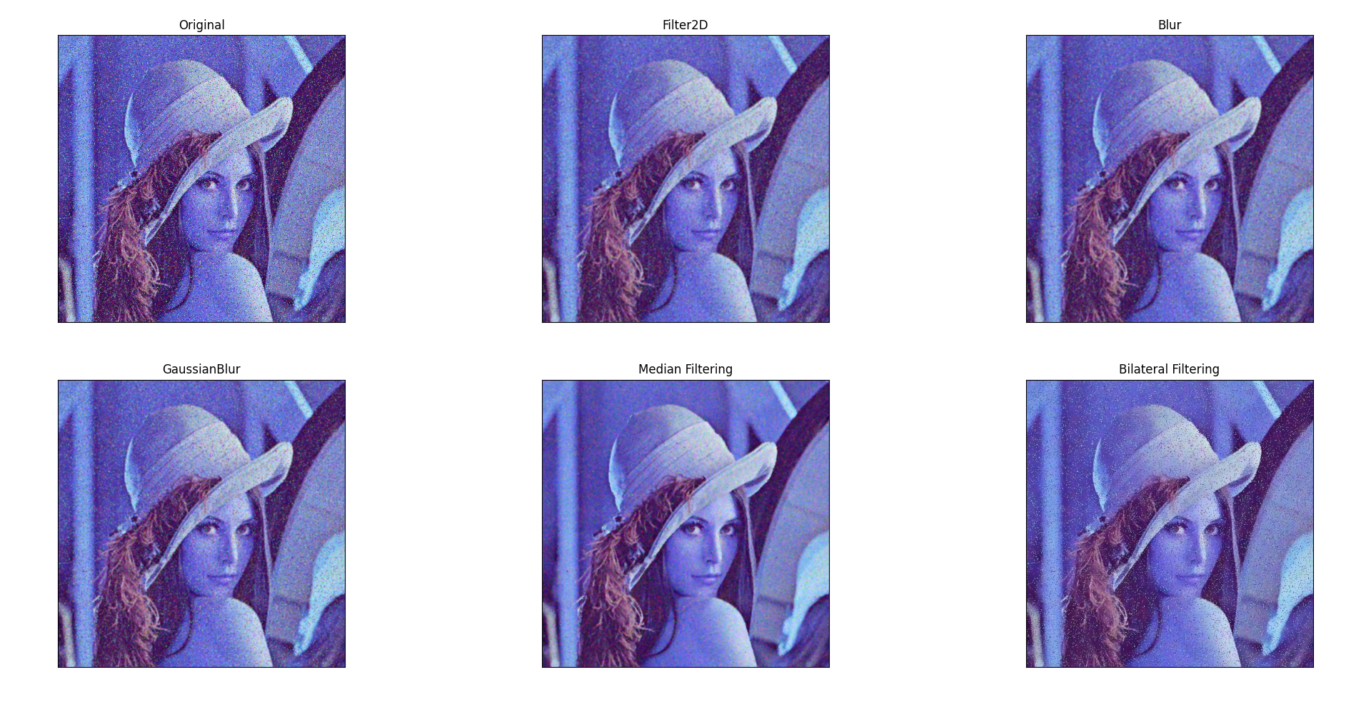 Apply the following filters to lena_noise2.jpg and lena_noise3.jpg