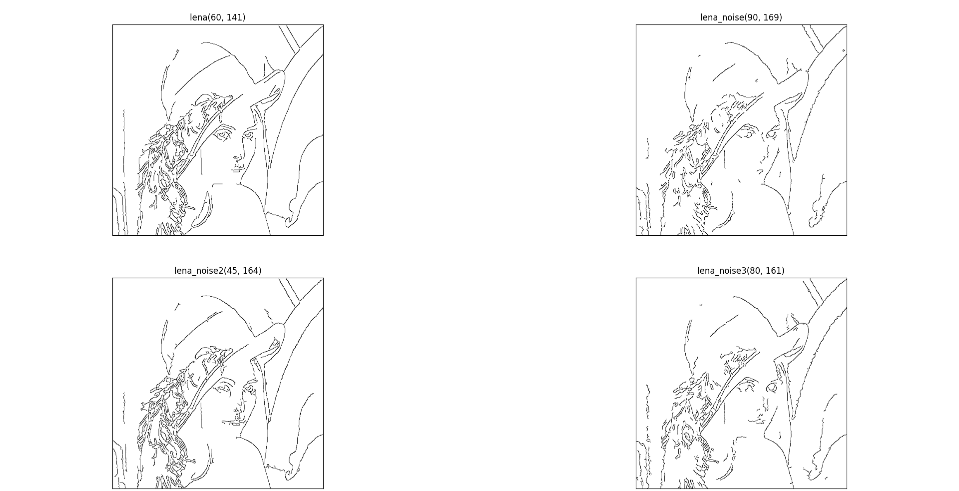 Take turns to use lena.jpg, lena_noise.jpg, lena_noise2.jpg and lena_noise3.jpg as image input files for edge detection. You need to apply Gaussian Blur and Median Blurring on gray level images to reduce the noise before perform the edge detection. (輪流使用lena.jpg、lena_noise.jpg、lena_noise2.jpg和lena_noise3.jpg作為圖像輸入檔進行邊緣檢測。在執行邊緣檢測之前,您需要對灰度圖像應用高斯模糊和中值模糊以減少噪點。)